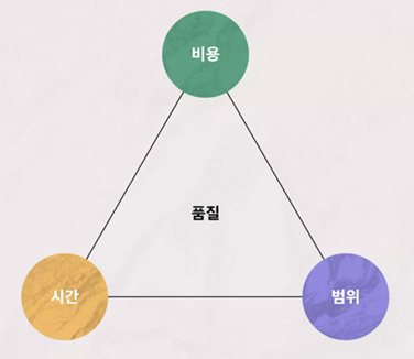 범위(Scope), 시간(Schedule), 비용(Cost) 가 세 가지 요소이다.